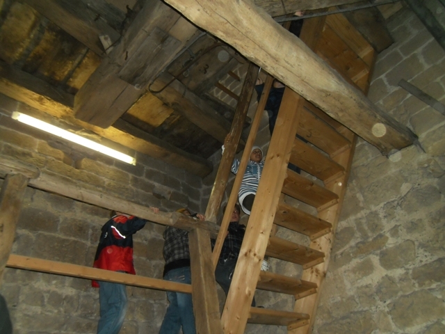 Gemeinsam gingen alle in den zweiten Glockenturm und schauten sich an, wie hoch man dort noch über Leitern kommen könnte.