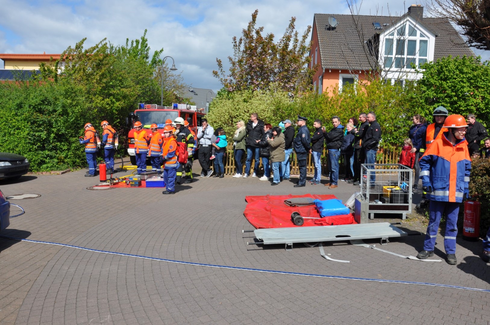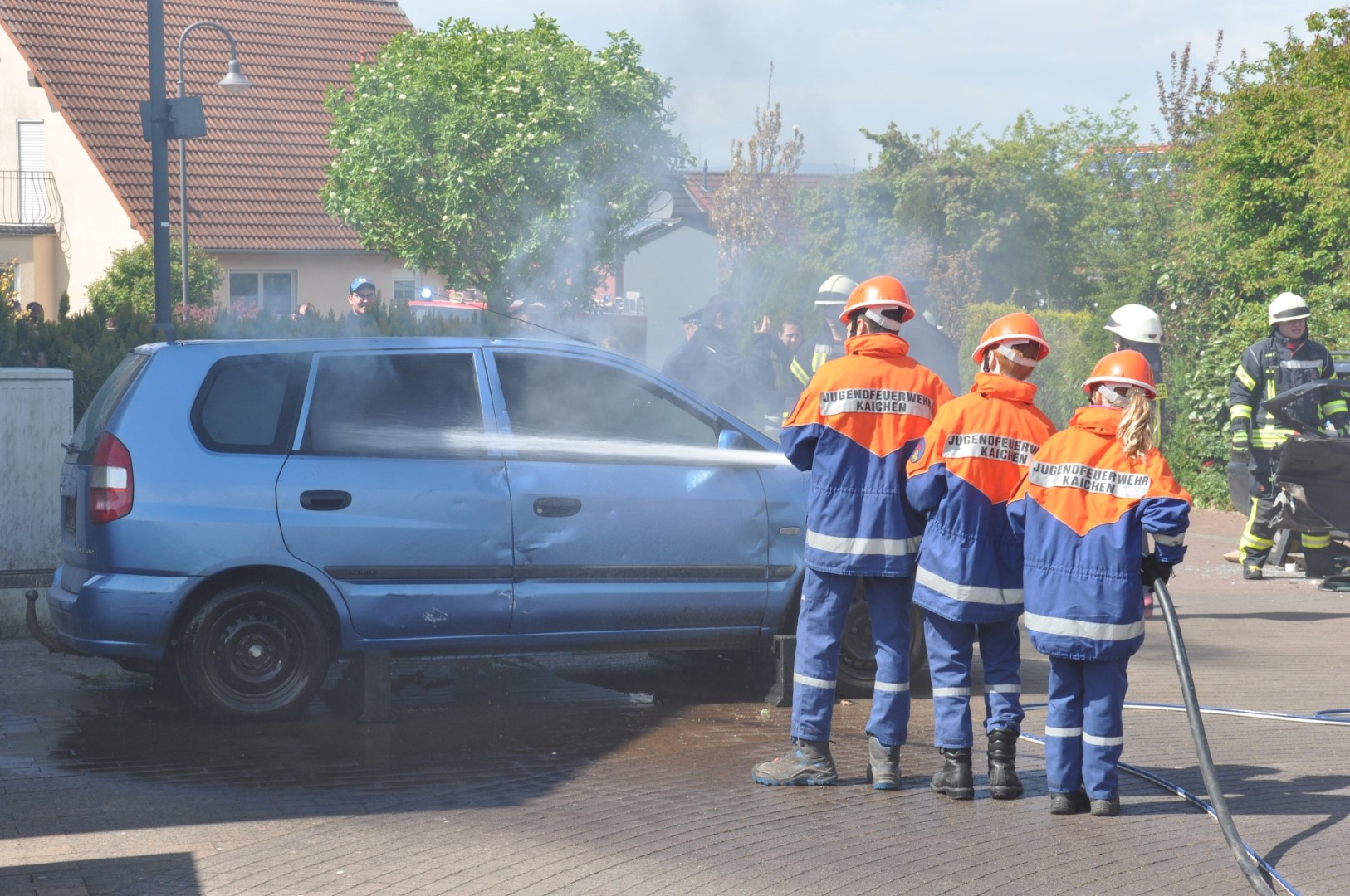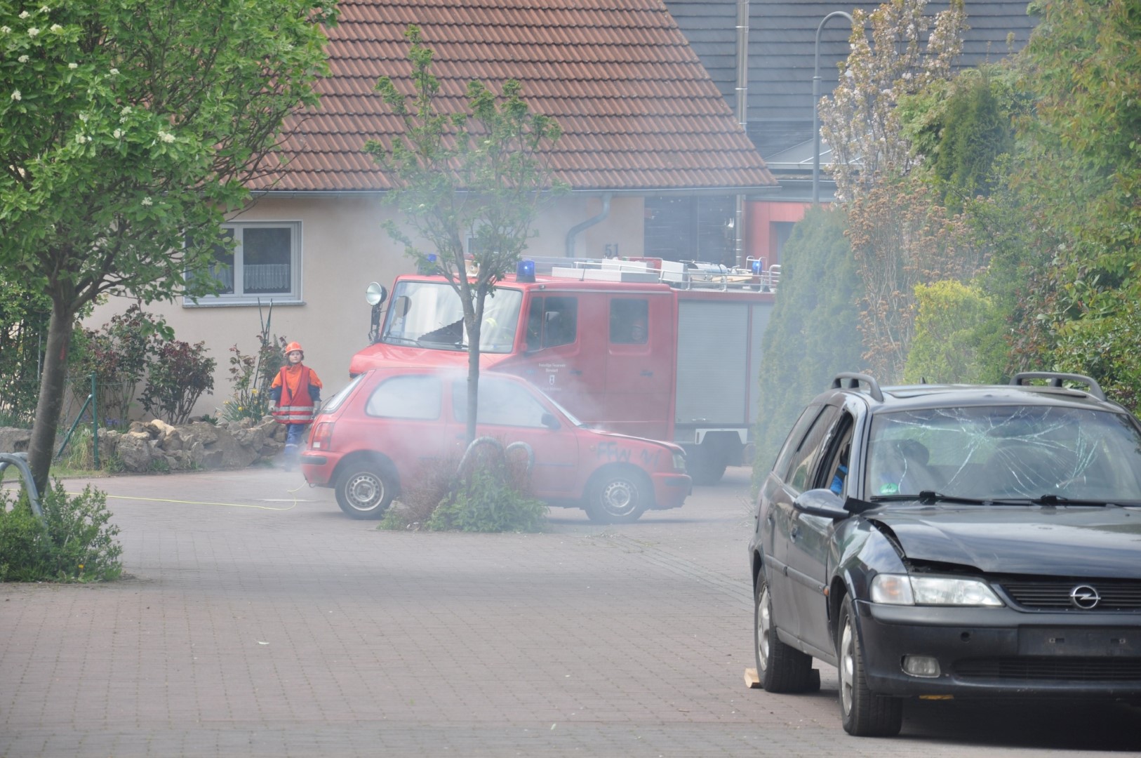 Die Einsatzkräfte wurden von ihrem Führungspersonal über die Lage informiert und eingewiesen. Sodann wurden die vier „Opfer“ geborgen und dem DRK zur Versorgung übergeben. Gleich darauf wurden die Löschangriffe begonnen und die hydraulischen Rettungsscheren eingesetzt. Es hieß: „Wasser marsch!“ Zwar befreite sich ein „Opfer“, rannte verwirrt umher, schrie zum Erbarmen und musste eingefangen und beruhigt werden, doch in kürzester Zeit hatten die jungen Wehrleute unter den Augen zahlreicher Zuschauer die Situation vollkommen im Griff.