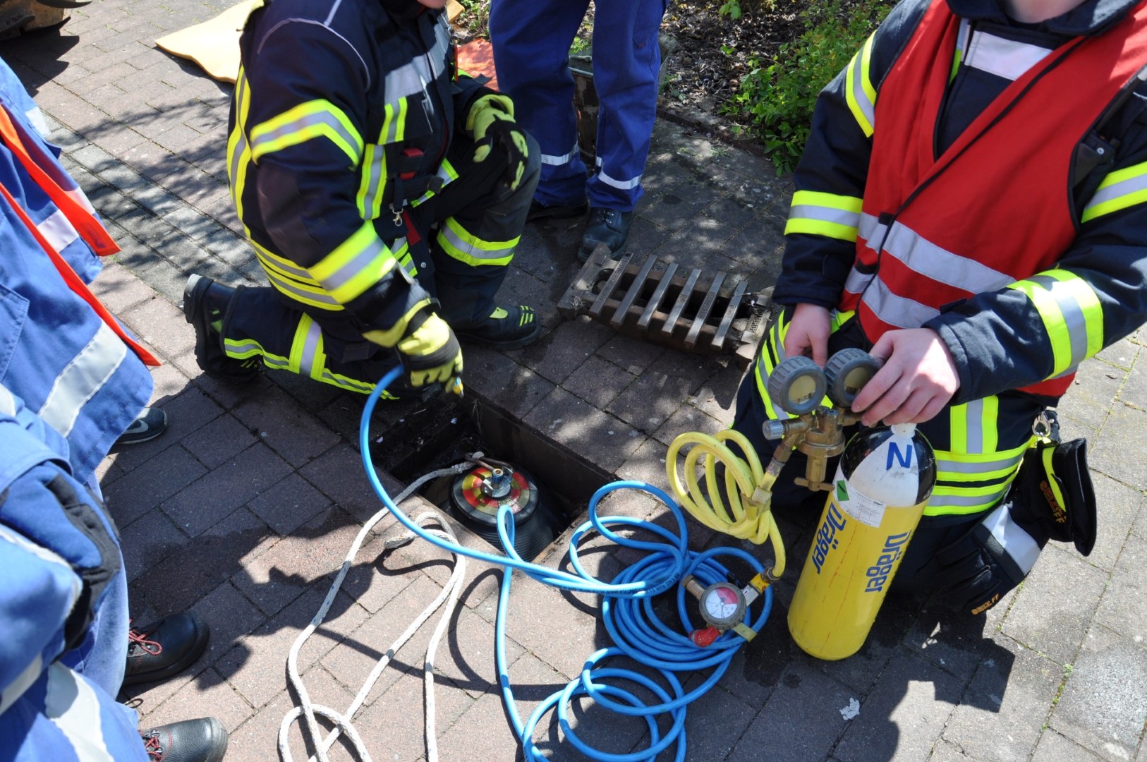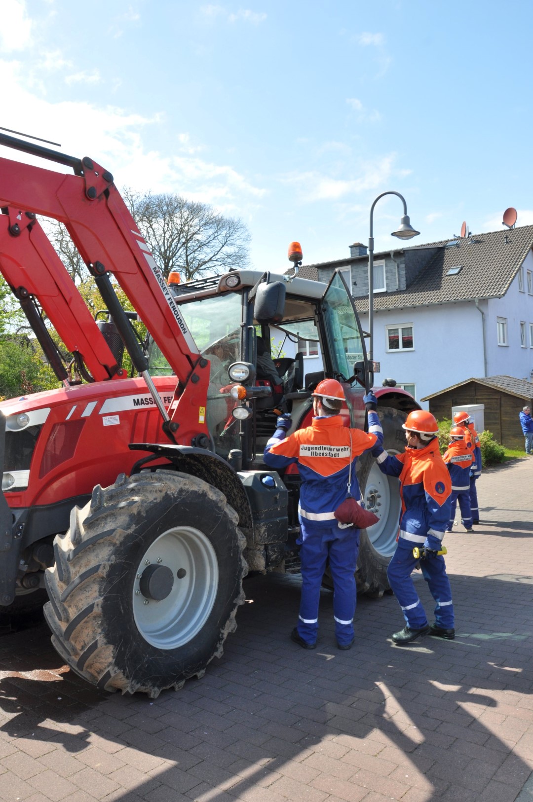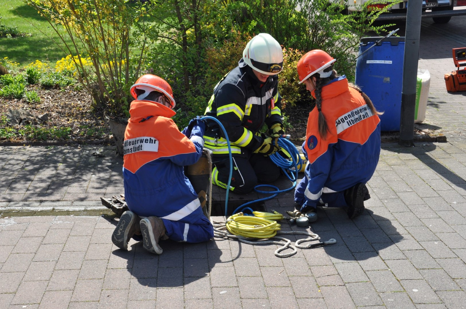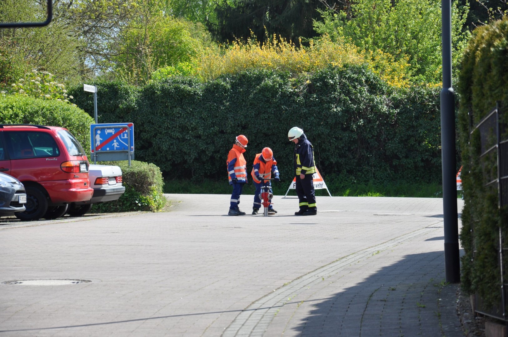 Die Einsatzkräfte wurden von ihrem Führungspersonal über die Lage informiert und eingewiesen. Sodann wurden die vier „Opfer“ geborgen und dem DRK zur Versorgung übergeben. Gleich darauf wurden die Löschangriffe begonnen und die hydraulischen Rettungsscheren eingesetzt. Es hieß: „Wasser marsch!“ Zwar befreite sich ein „Opfer“, rannte verwirrt umher, schrie zum Erbarmen und musste eingefangen und beruhigt werden, doch in kürzester Zeit hatten die jungen Wehrleute unter den Augen zahlreicher Zuschauer die Situation vollkommen im Griff.