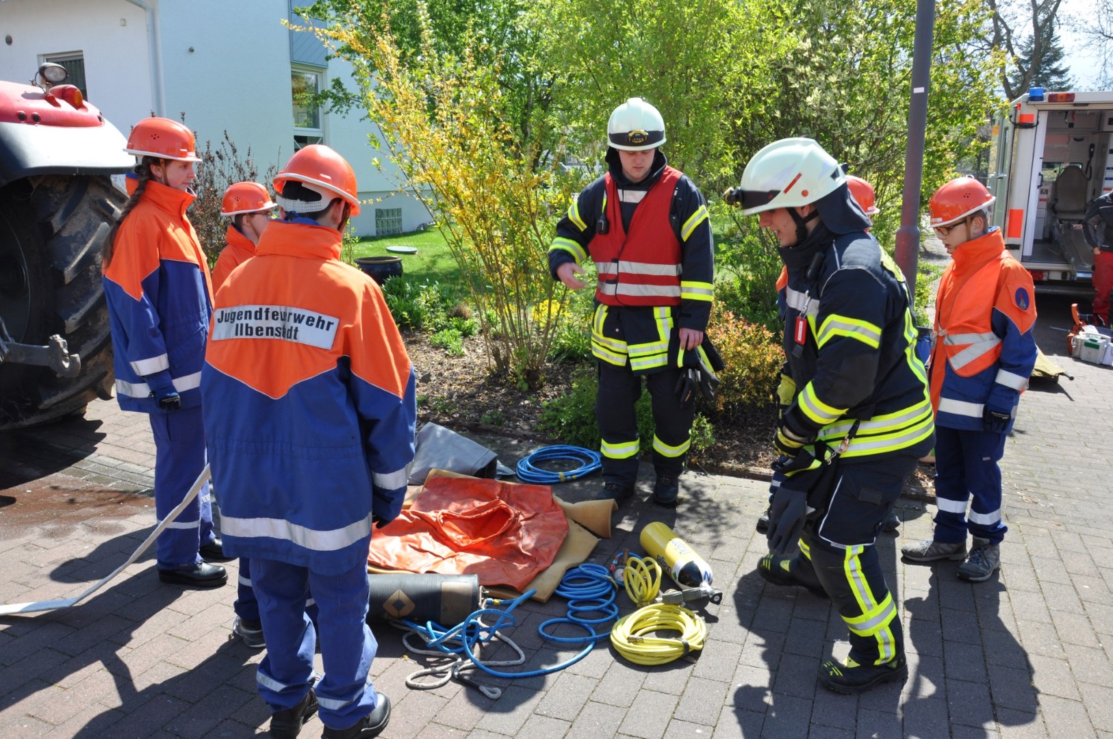 Niddatal/Wöllstadt (udo). In der Sternbacher Straße im Osten Bönstadts stieg am frühen Samstagnachmittag dichter Qualm auf. Gleich darauf heulten die Sirenen und ein Rettungswagen des DRK sowie fünf Löschfahrzeuge und fünf Mannschaftstransportwagen der Feuerwehr trafen ein. Bei der gemeinsamen Übung der fünf Jugendfeuerwehren Niddatals und Nieder-Wöllstadts wurde die Lage angenommen, dass ein Traktorfahrer auf dem Weg durch die Sternbacher Straße einen Herzinfarkt erlitt und mit drei Pkw kollidierte, die sofort zu brennen begannen.