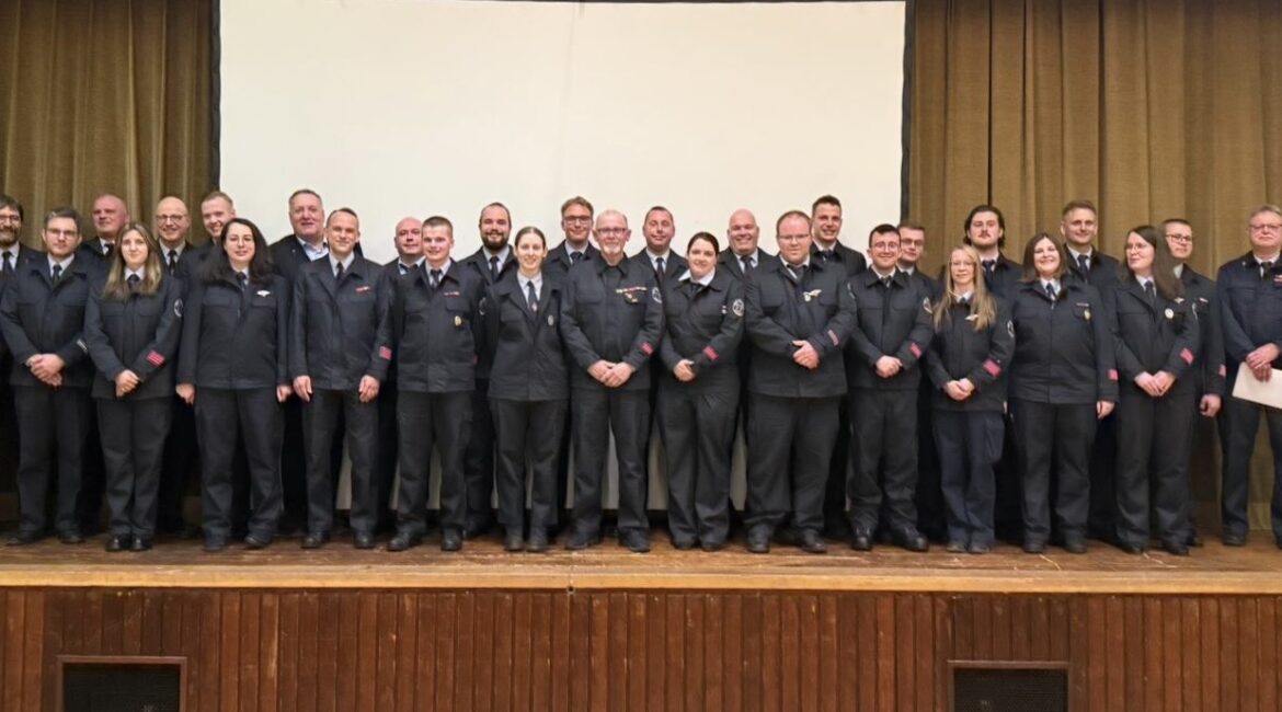 Kreisbrandmeister Leon Gierhardt überbrachte die Grüße des Kreisbrandinspektors und informierte über aktuelle Entwicklungen auf Kreisebene. Dazu zählen steigende Lehrgangszahlen, neue Ausbildungskonzepte sowie die Bildung überörtlicher Einheiten, etwa für Wald- und Vegetationsbrände.