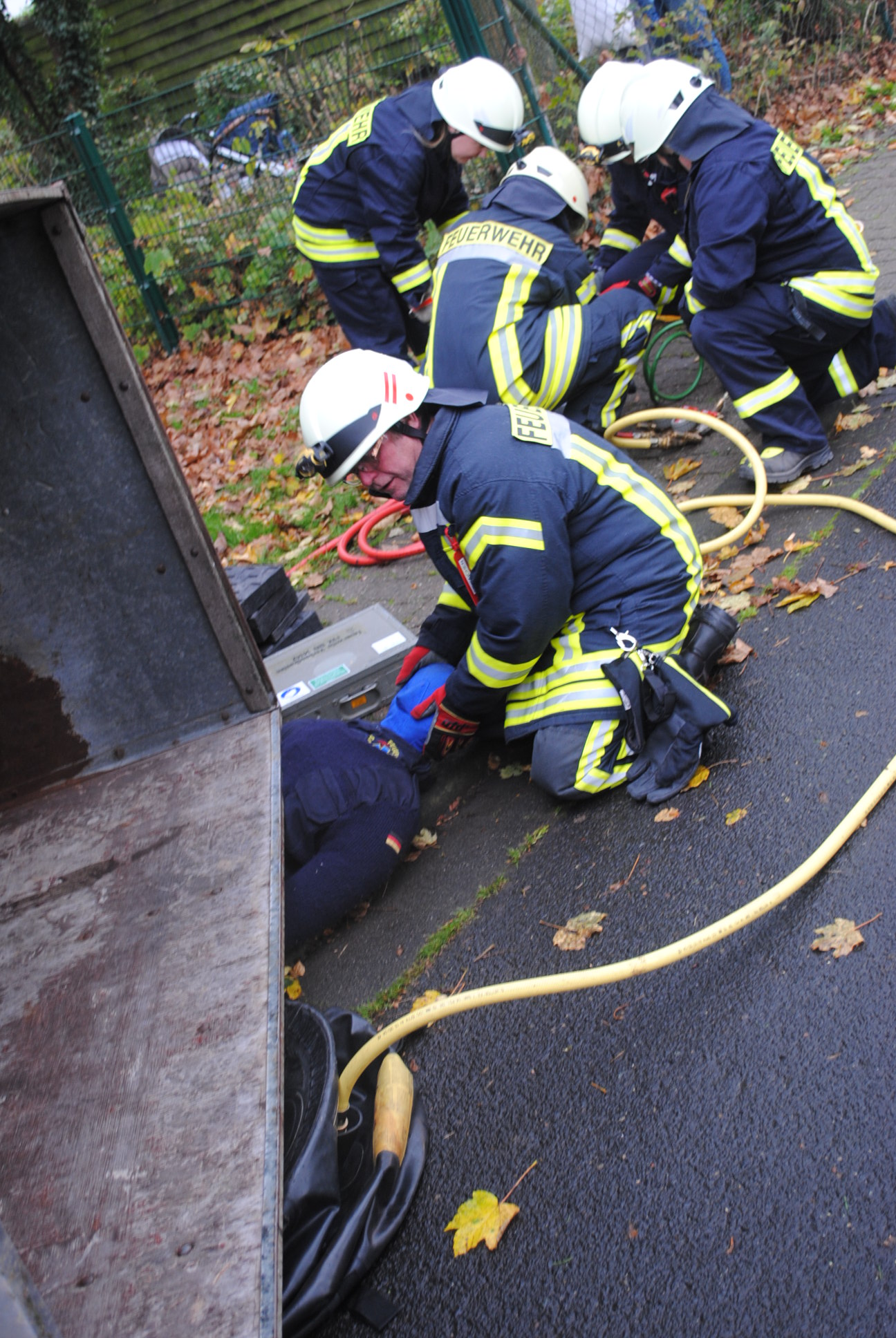 Die Einsatzkräfte wurden vom Einsatzleiter Christian Behnken über ihre Aufgaben informiert. Das Gelände wurde abgesperrt und das erste „Opfer“ aus der Fahrerkabine geborgen. Auch der lädierte Treckerfahrer und der dritte Verletzte, der unter den Hänger geraten war, wurden gerettet. Sie benötigten vor allem seelischen Trost. Das Hebegerät der Feuerwehr Kaichen kam zum Einsatz.
