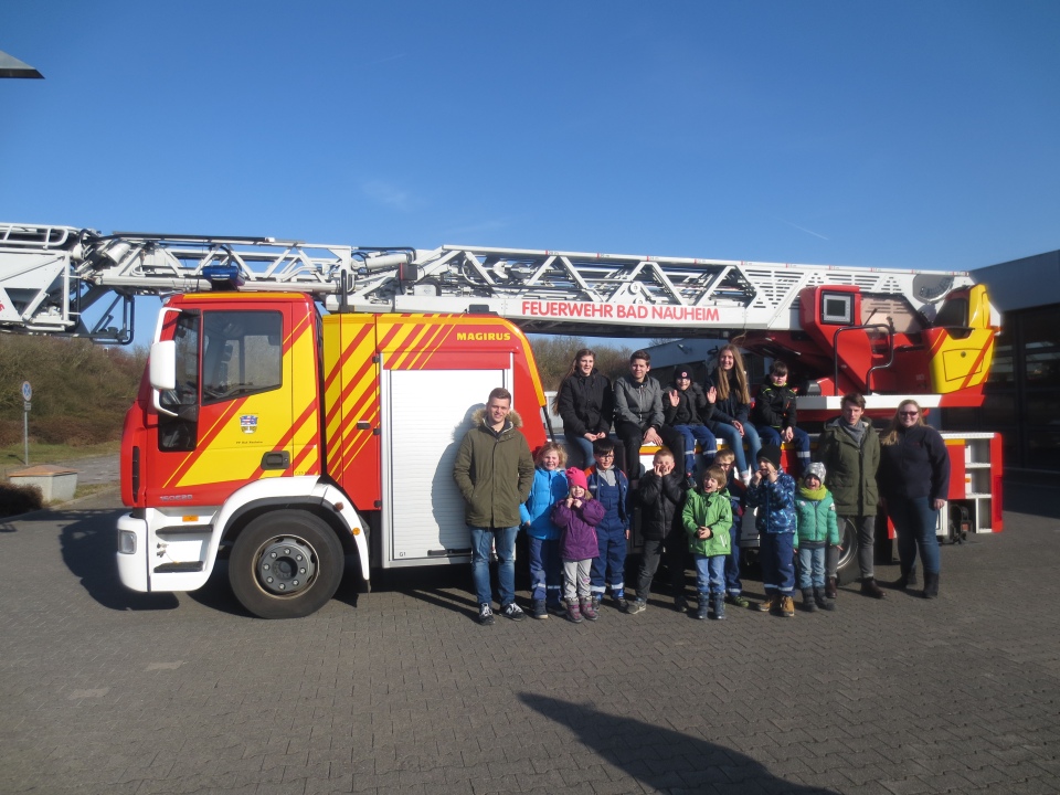 13 Kinder und Jugendliche mit ihren vier Betreuern wurden von der Bad Nauheimer Jugendwartin Katharina Zimmer empfangen. Die Jugendwartin führte die Gruppe zu Beginn durch die großen Umkleidekabinen hin zu der riesigen Fahrzeughalle mit ihrer großen Anzahl von Einsatzfahrzeugen.