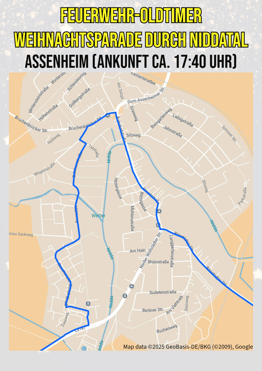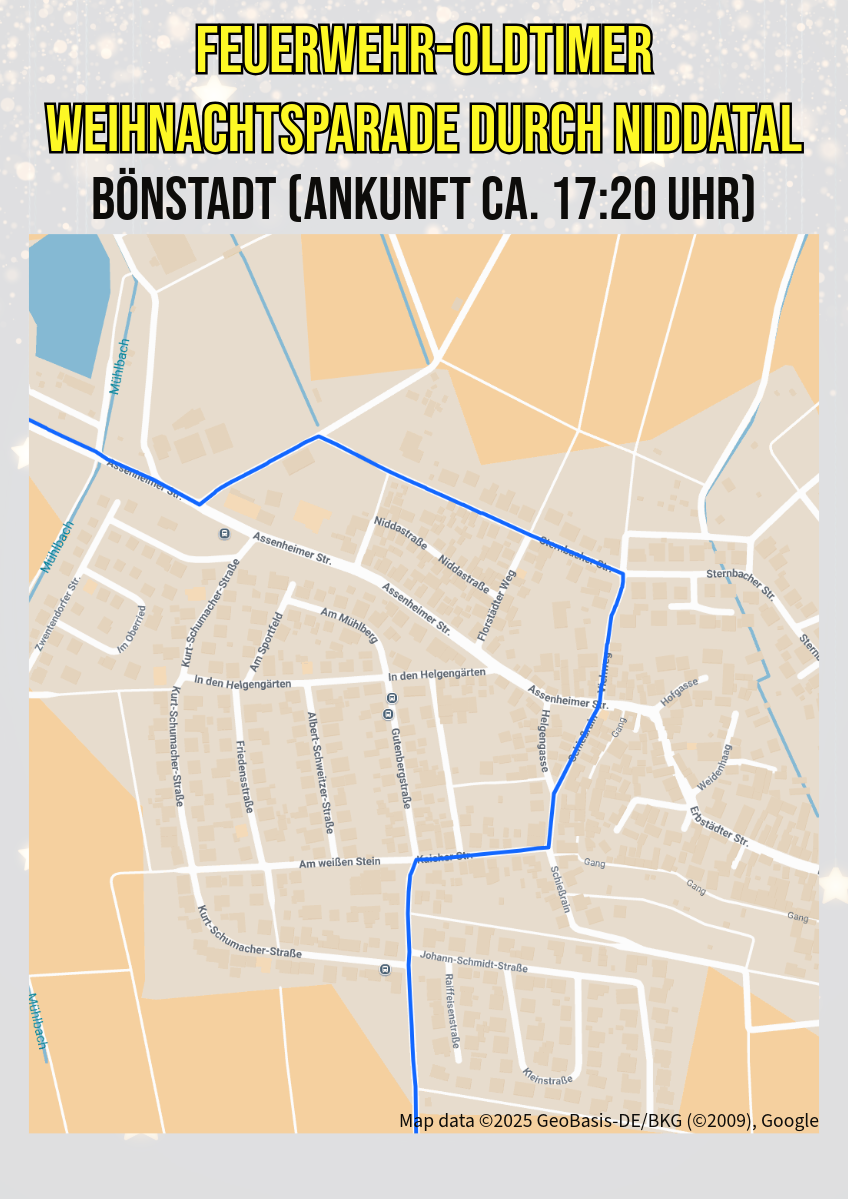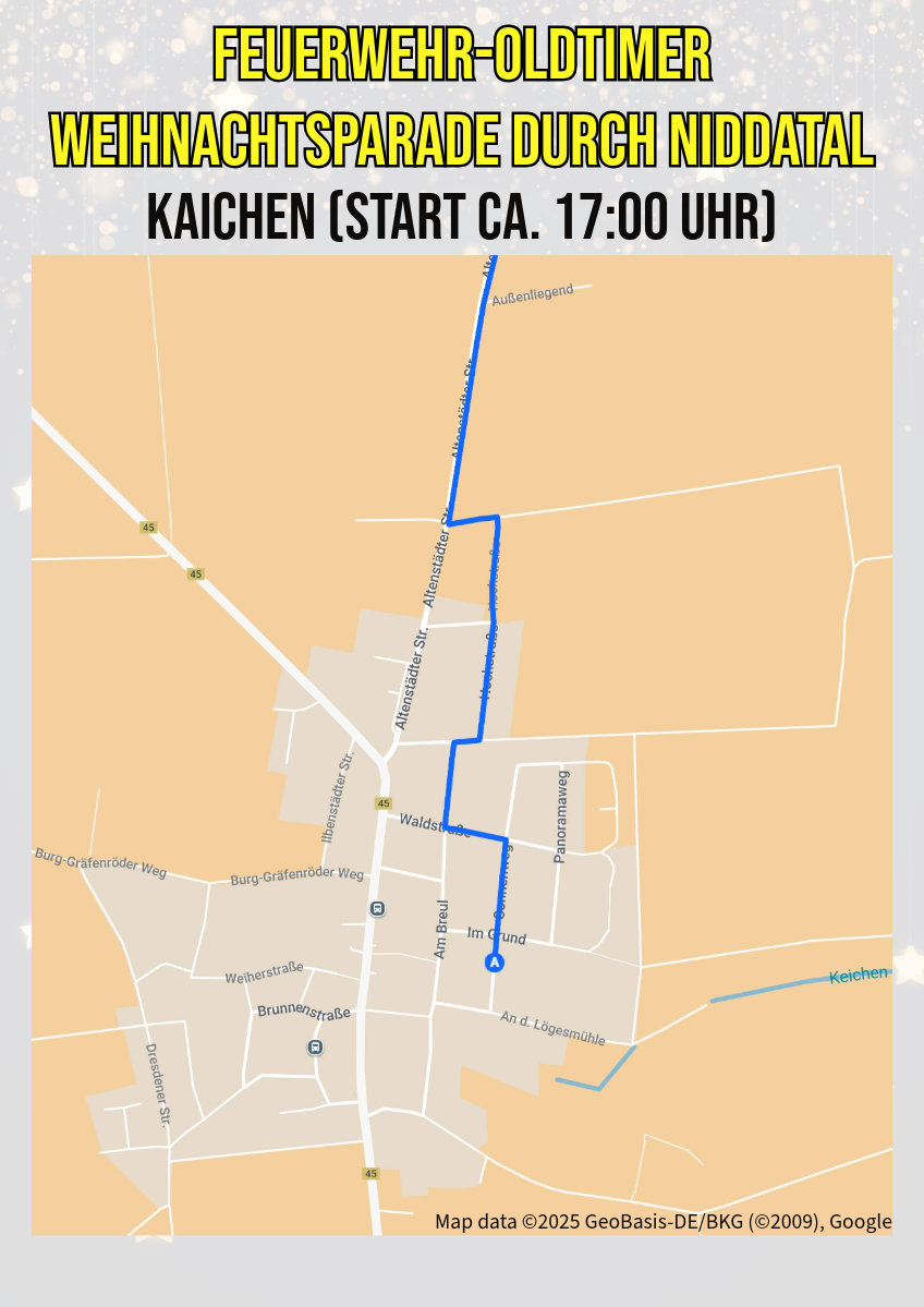 Die festliche Feuerwehr-Oldtimer Weihnachtsparade führt durch die Straßen von Niddatal und bringt weihnachtliche Stimmung in die Region! Die Parade beginnt um 17 Uhr am Bürgerhaus Parkplatz Kaichen und zieht dann durch Kaichen, Bönstadt, Assenheim nach Ilbenstadt, wobei zahlreiche Oldtimer-Feuerwehrautos in weihnachtlichem Glanz erstrahlen.